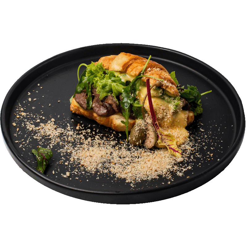 Two poached eggs, hollandaise sauce, mixed salad, lightly salted salmon. Served on a brioche bun with Caesar dressing.
