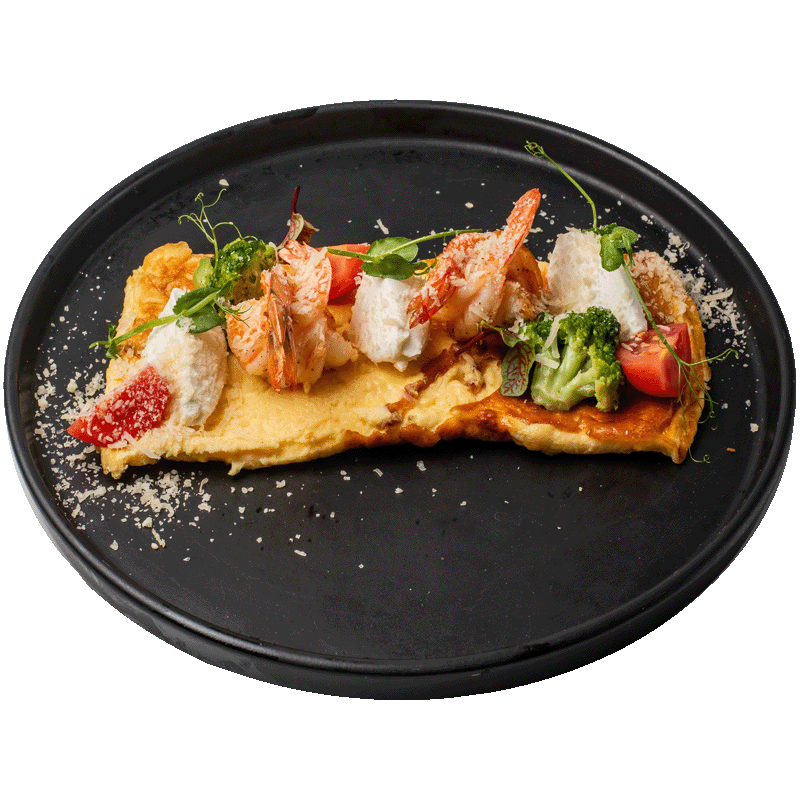 Three-egg omelet, cream cheese, broccoli, cherry tomato, parmesan, grilled tiger shrimp.