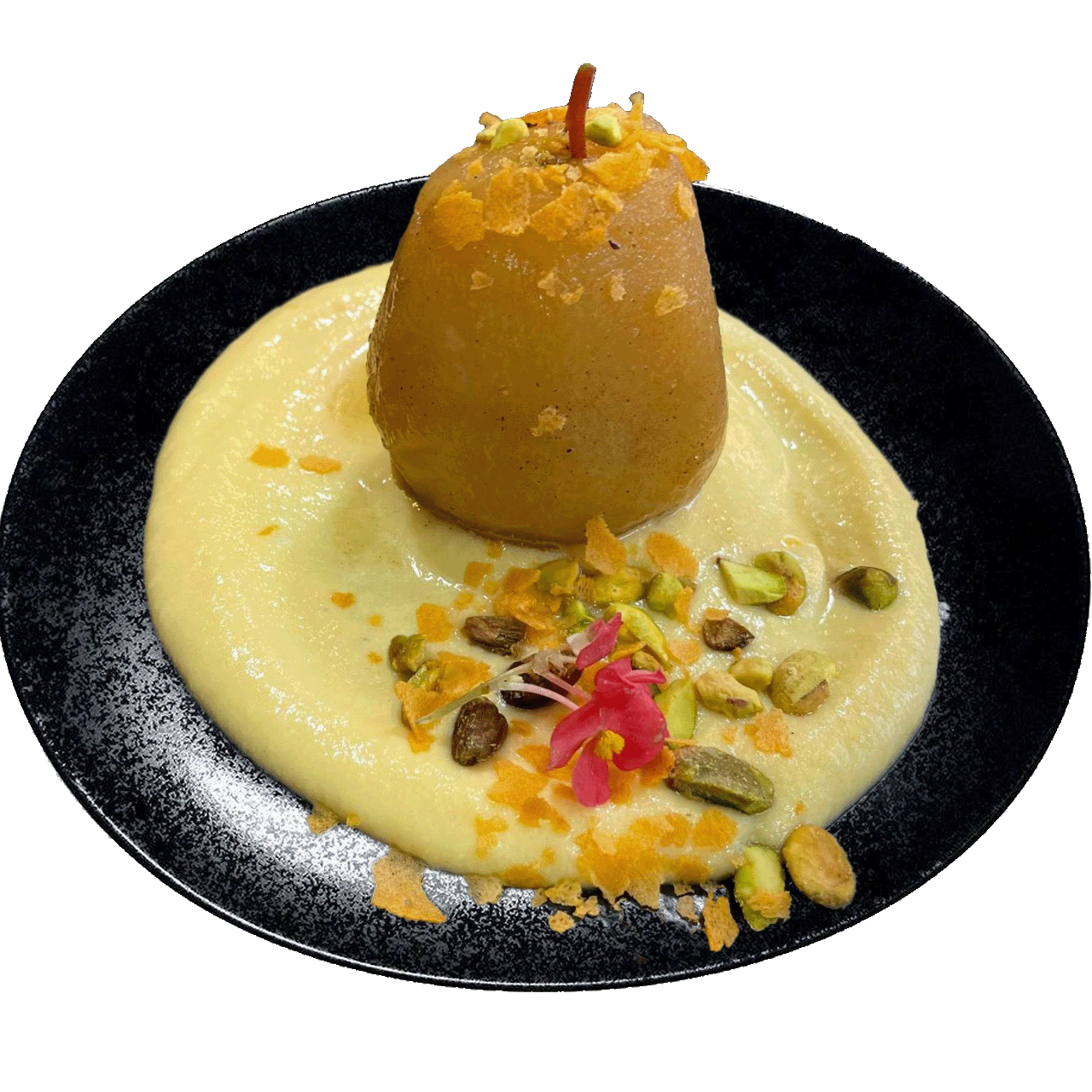 Poached pear in white wine on a pillow with Catalana custard sauce, served with nuts
