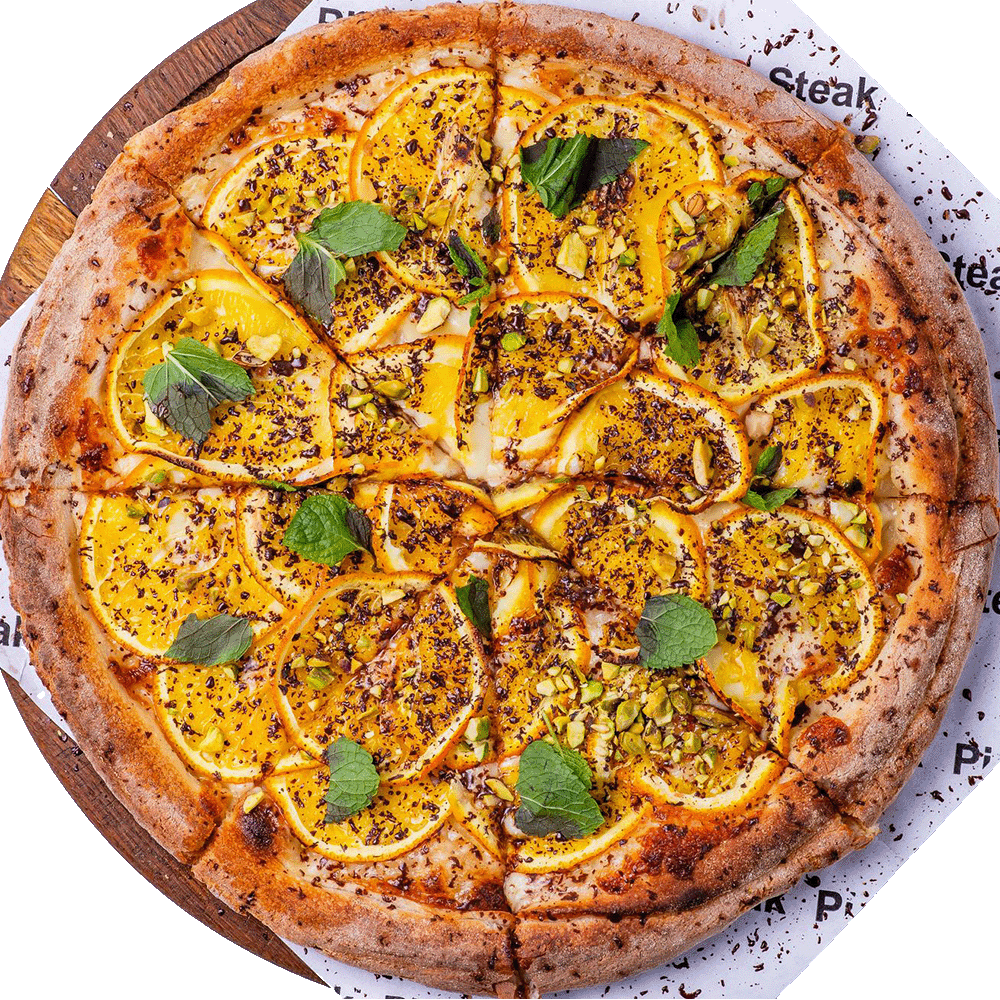 Mozzarella, cream sauce, orange, chocolate, mint, pistachio.