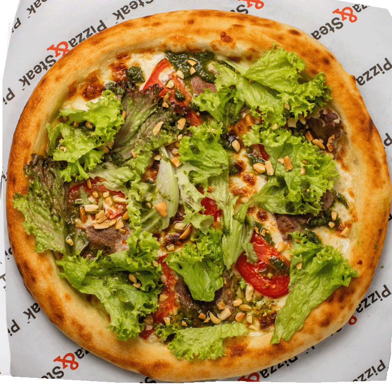 Mozzarella, cream sauce, duck breast, tomatoes, mixed salad, pesto sauce.
