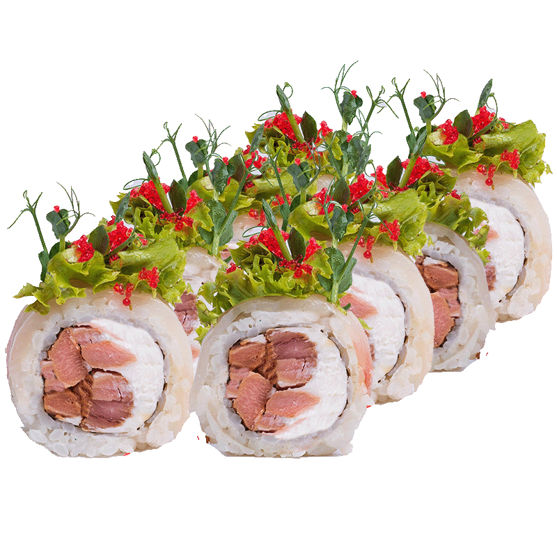 Rice, nori, baked duck fillet, feta cheese, lettuce, pear, apple sauce, microgreens, red masago caviar