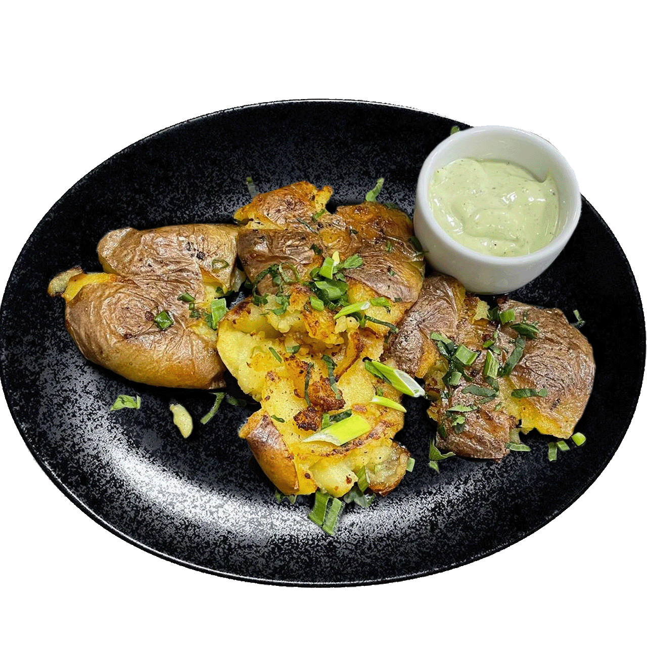 fried potatoes with fragrant herbs, served with garlic and dill sauce