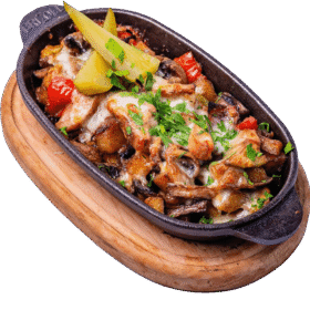 Свиняча шия, картопля, печериці, болгарський перець, кабачок, цибуля Марс, солодкий соус Чилі, Моцарела.