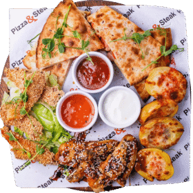 курячі крильця, картопля з сиром та беконом, кесаділья, курячі стріпси