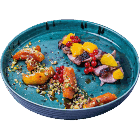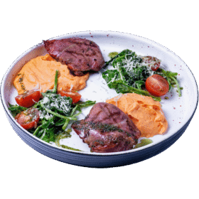 Обсмажена теляча вирізка з болгарським перцем, кабачком у соусі з чорної вишні, маринований гарбуз, микс салату. Страва має гостринку