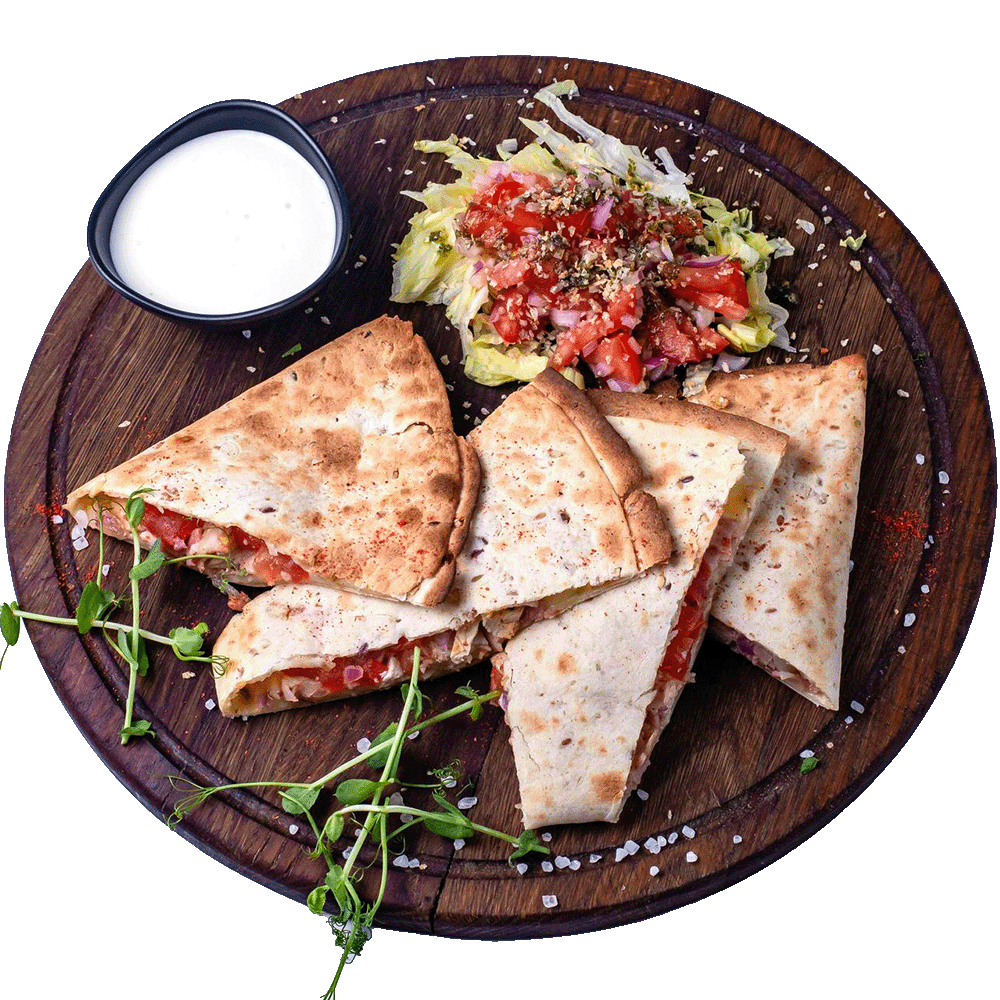 Мексиканська закуска з беконом, запеченою куркою, сиром Моцарела, помідором та червоною цибулею.