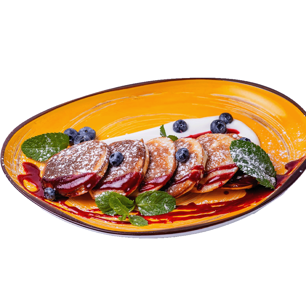 Невеликі американські млинці! Подаються з ягідним соусом та сезонними ягодами.