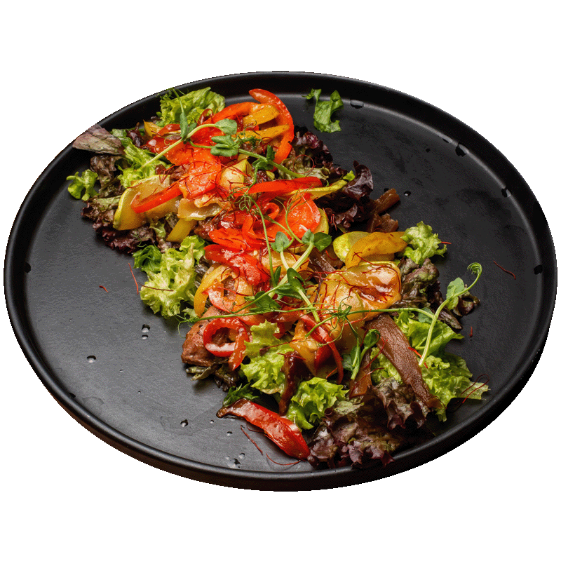 Обсмажена теляча вирізка з болгарським перцем, кабачком у соусі з чорної вишні, маринований гарбуз, микс салату. Страва має гостринку
