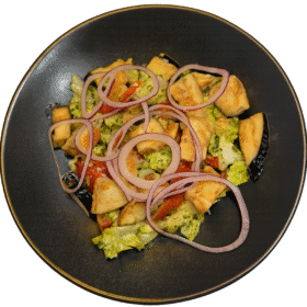 Салат з айсбергом, томатами, червоною цибулею, пармезаном, болгарським перцем і хрусткими баклажанами, заправлений соусом на основі кінзи.